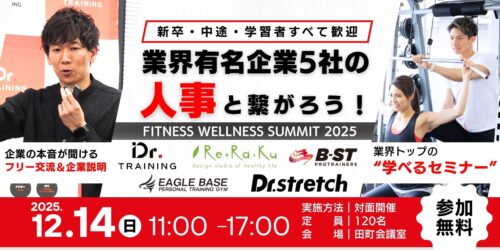 フィットネス業界の就職・転職を考える方へ|12/14にトップ企業5社が集まるスペシャルイベント開催 12/14開催|業界トップ5社の“人事”と直接つながる1日 FITNESS WELLNESS SUMMIT 2025 た … 続きを読む 12/14開催|業界トップ5社の“人事”と直接つながる1日 FITNESS WELLNESS SUMMIT 2025