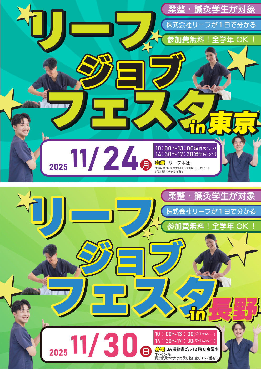柔整・鍼灸の学生さんへご自宅やトレーナー現場ですぐに活用できる技術が身に付く!”特別な1日”を体験してみませんか?? リーフの新人研修体験・治療体験・先輩スタッフとの交流ができる人気イベント『リーフジョブフェスタ』を開催 … 続きを読む 【技術が身に付く!】リーフジョブフェスタ開催|11/24東京・11/30長野