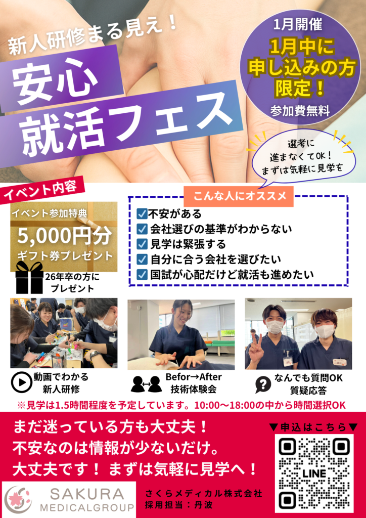新人研修の様子や院内の雰囲気を動画で公開し、実際の施術を体験できる技術体験(Before→After)や、就活・研修・働き方についての質問相談会を行います。
