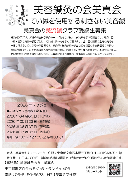 美真会会員・一般鍼灸師、学生4000円 非会員鍼灸師・鍼灸学生は初回のみお試し参加可能4000円 |